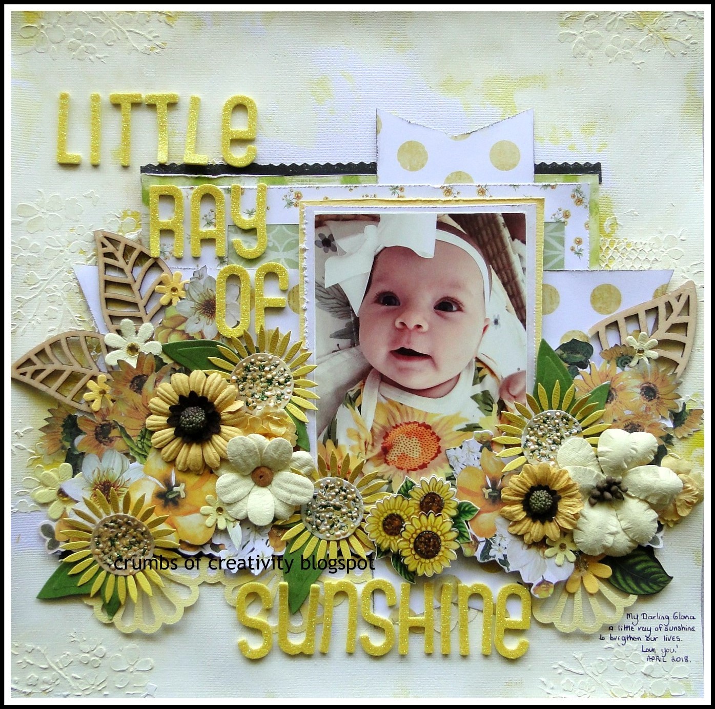 When I saw this image I thought straight away of my Darling Grand Daughter, she has brought such sunshine into my life, and I love the sweet photo of her wearing her onesie with sunflowers on it!! so I knew I wanted to scrap it, and this challenge was the perfect invitation to do it!!some closer views..